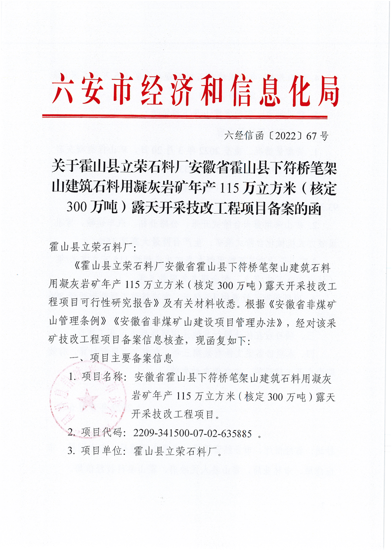 关于霍山县立荣石料厂安徽省霍山县下符桥笔架山建筑石料用凝灰岩矿年产115万立方米(核定300万吨)露天开采技改工程项目备案的函