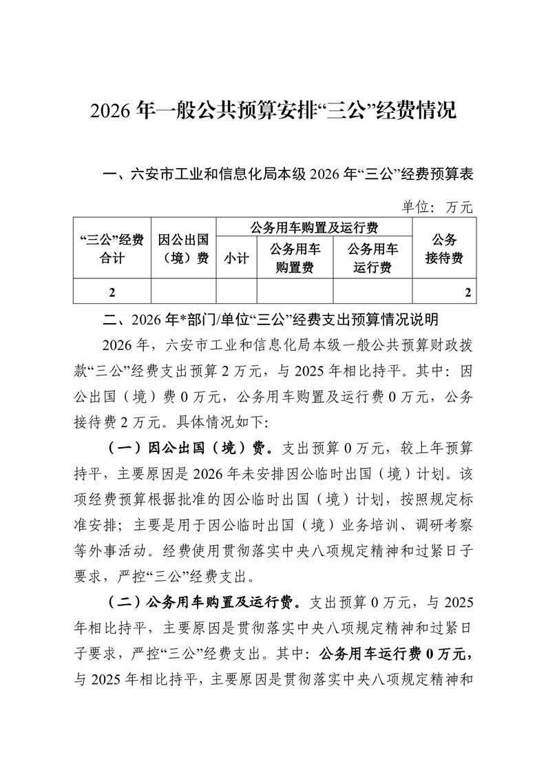 六安市工业和信息化局本级2026年一般公共预算安排“三公”经费情况公开