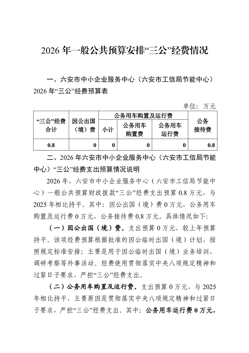 六安市中小企业服务中心(六安市工信局节能中心)2026年一般公共预算安排“三公”经费情况公开